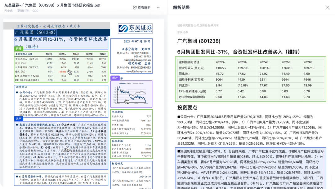 将你所需阅读的纸质材料通过拍照、扫描等方式上传,360AI知识库能自动忽略复杂的背景水印,精准剥离多栏干扰,将研报中的横跨多页的复杂大表、对比图表完美还原为结构化数据,确保数据引用"零误差"。