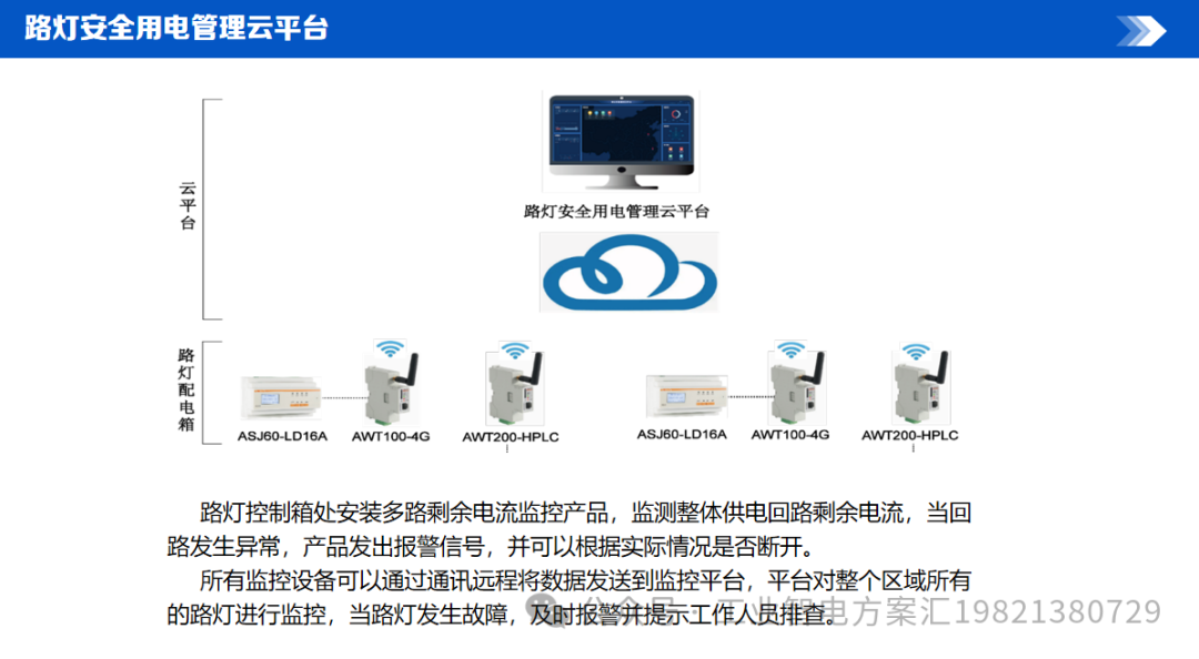 市政照明 :ASJ60多路监控产品安装在路灯控制箱内,单台设备监控16个回路 ,不仅实现本地报警与保护,更通过RS485通讯将数据上传至智慧路灯管理云平台。