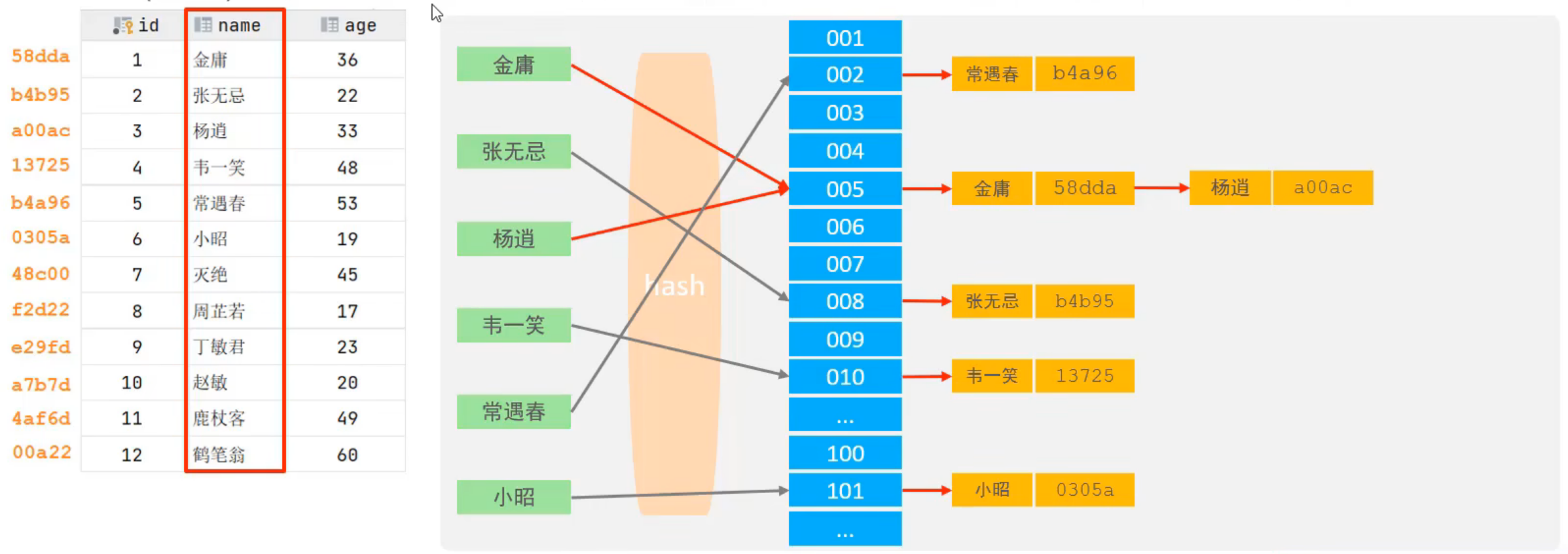 | Hash | 底层数据结构是用哈希表实现,只有精确匹配索引列的查询才有效,不支持范围查询 |