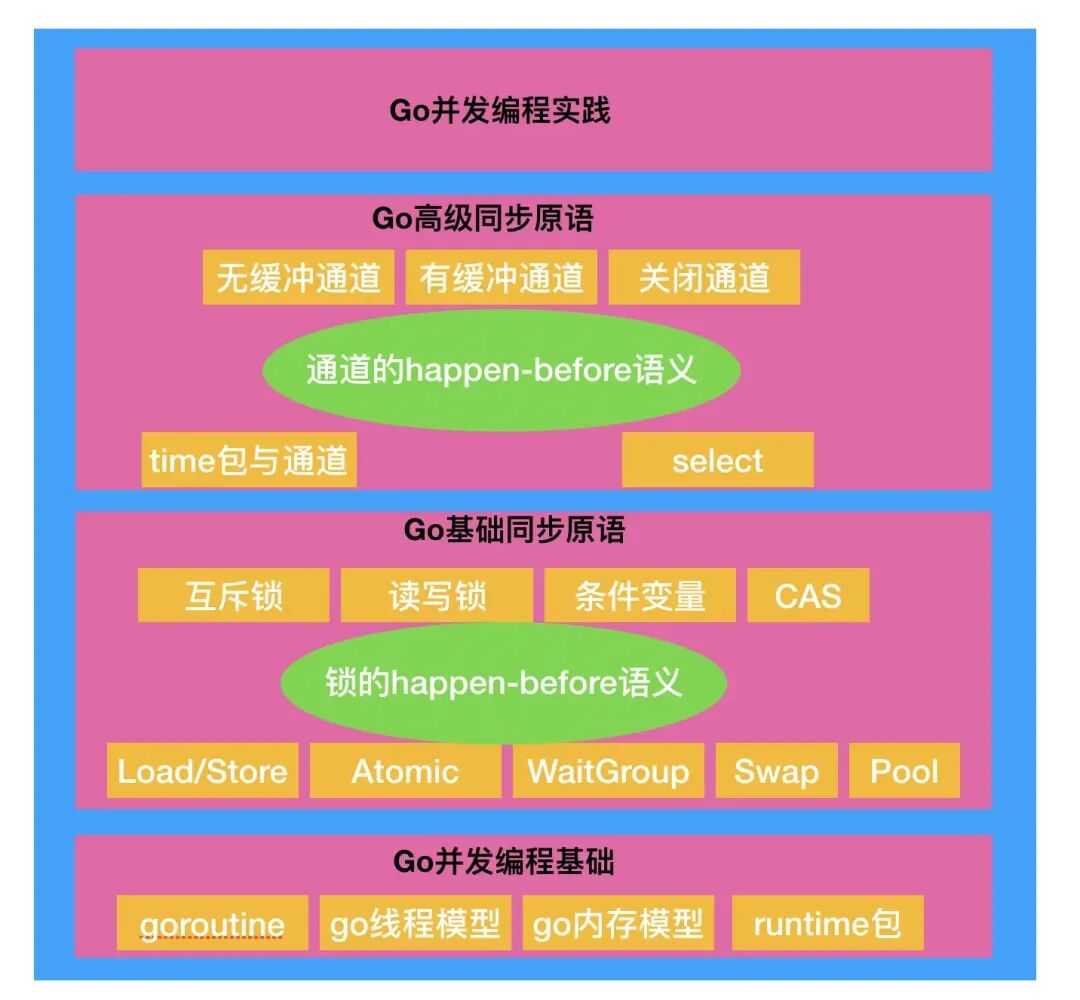 从下向上,首先通过基础篇讲解 Go 的线程模型、内存模型和 goroutine 的基础知识;然后深入讲解 Go 提供的低级同步原语------各类锁;接着讲解 Go 独特的通信原语------channel;最后通过实战案例,深刻理解"通过通信来共享内存"这一并发哲学的工程价值。