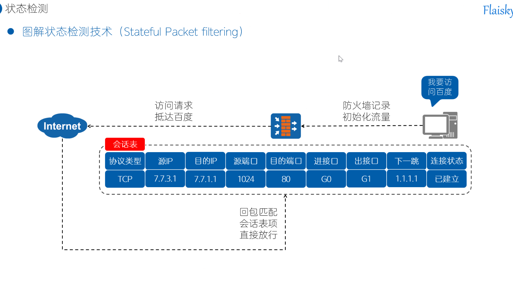 当外网服务器返回响应(SYN-ACK、数据包)时,防火墙检查状态表,发现这个响应匹配已有连接,于是自动放行,不需要再写一条"从外网到内网"的放行规则。