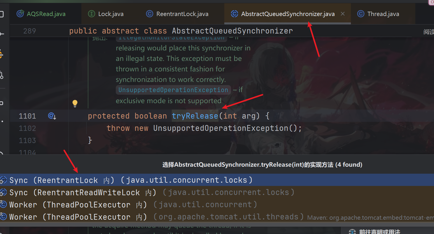tryRelease(arg)尝试释放锁。- 这个方法由子类实现,比如