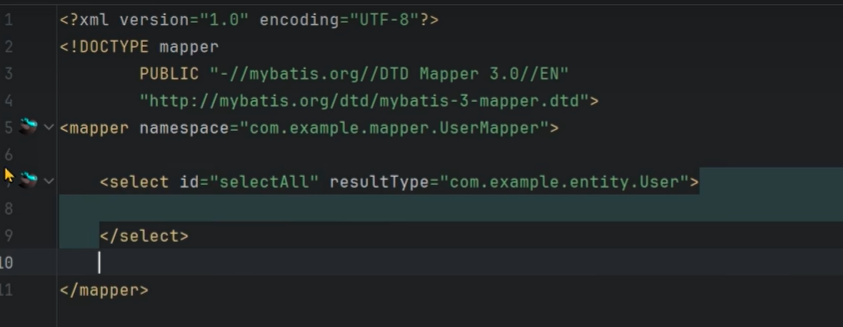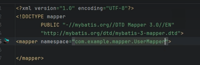 然后修改namespace绑定为UserMapper,前面的小鸟可以实现自动跳转到mapper和跳回