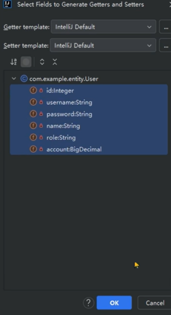 然后Alt+F12,选择getter and setter