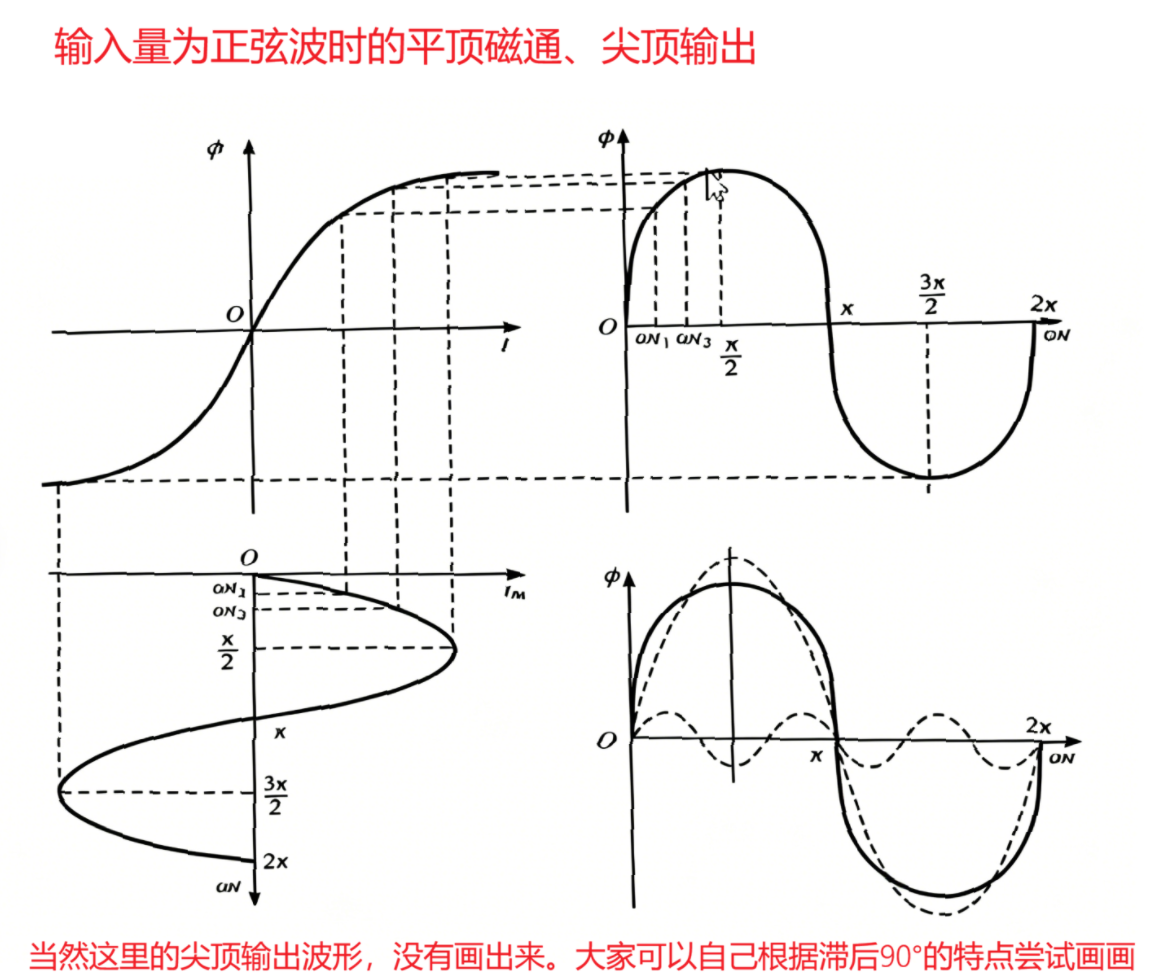 - 输入正弦电流 → 输出 B 为平顶波,→ 感应电动势畸变成尖顶波;