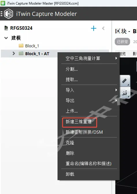 右键空三计算完成的 Block,执行【新建三维重建】操作