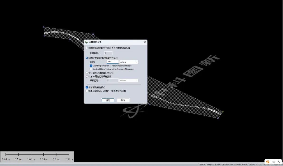 若手绘线条或 CAD 导入线条的顶点数量过少,会导致空间渲染效果不佳,可通过 GlobalMapper 对线条顶点进行加密,建议按 100 米 / 个点的密度设置,具体可根据实际融合效果灵活调整,操作步骤:选中需加密的要素,右键执行顶点加密功能即可。