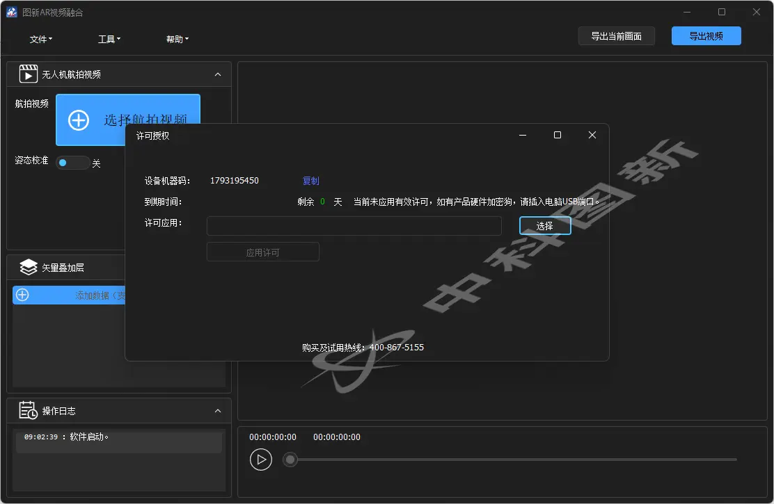 ·软件初次启动时,会弹出许可授权提示,用户需插入硬件狗,或向工作人员发送设备机器码申请授权文件