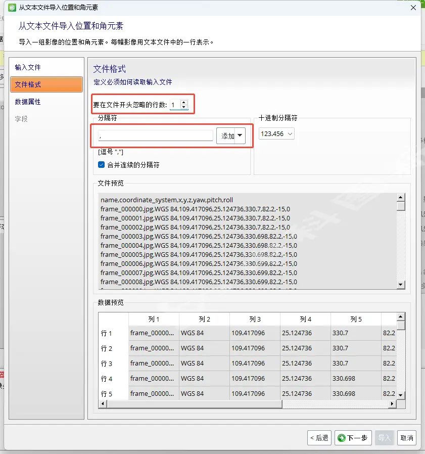 分隔符选择【逗号】,并删除 pos 文件的第一行内容