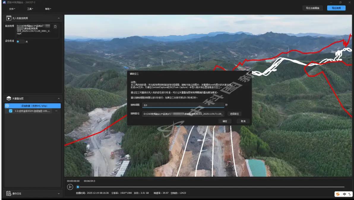 若播放时发现矢量叠加层存在抖动,希望画面更平滑,可通过【视频姿态校准】功能解决,该功能需借助空三辅助对视频抽帧,最终通过 ContextCapture(iTwinCapture)做空三计算,并导出空三后的 xml 姿态文件