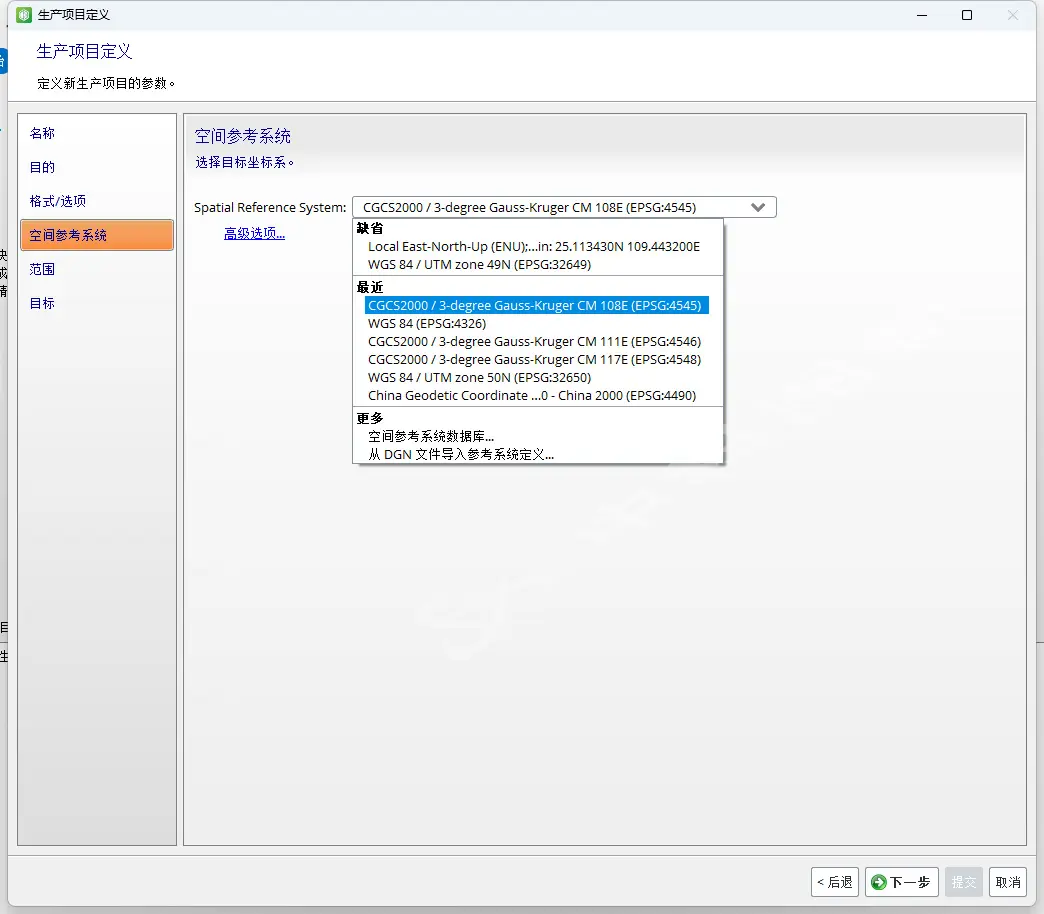 4. 空间参考系统选择国家 2000 平面坐标,禁止选择经纬度