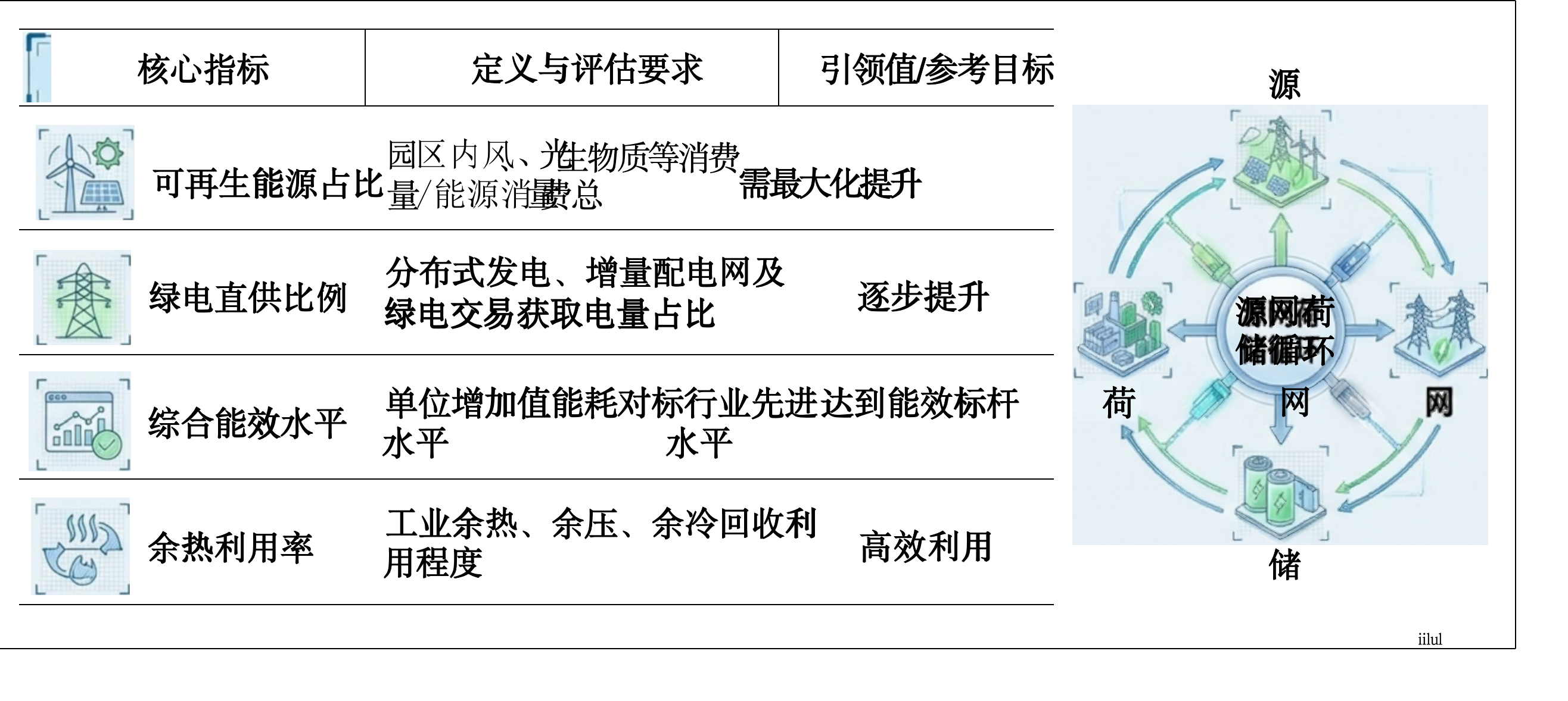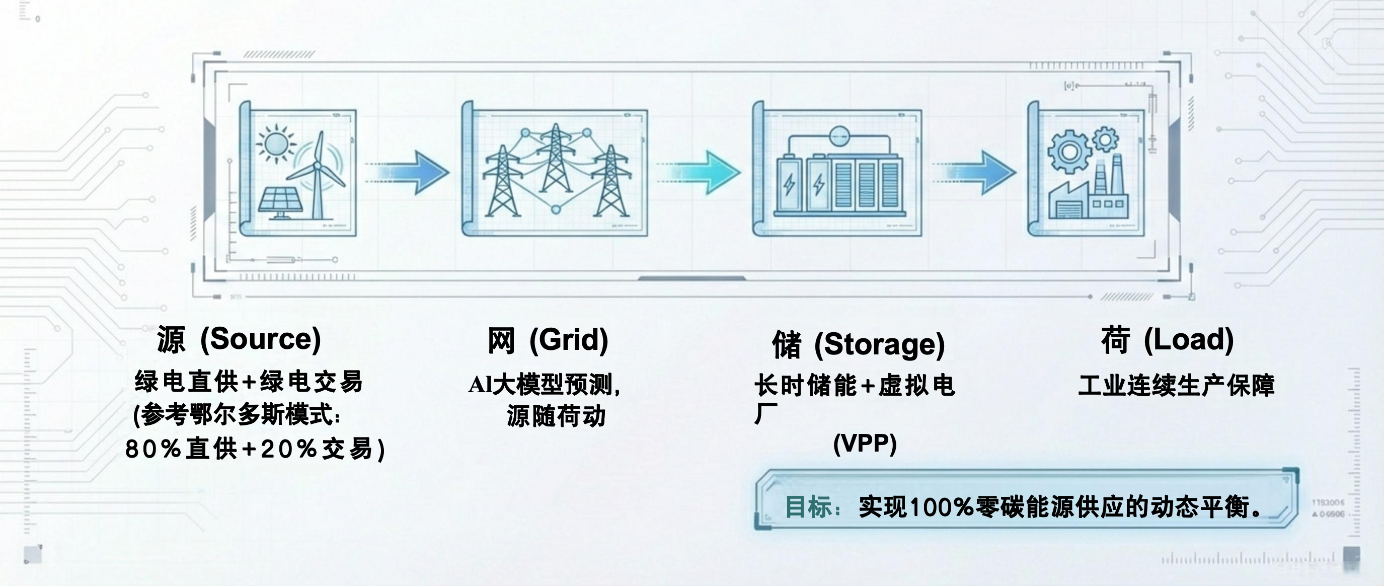 能源转型是园区的底层逻辑。评估重点在于测算"源网荷储"各环节的绿电消纳能力。