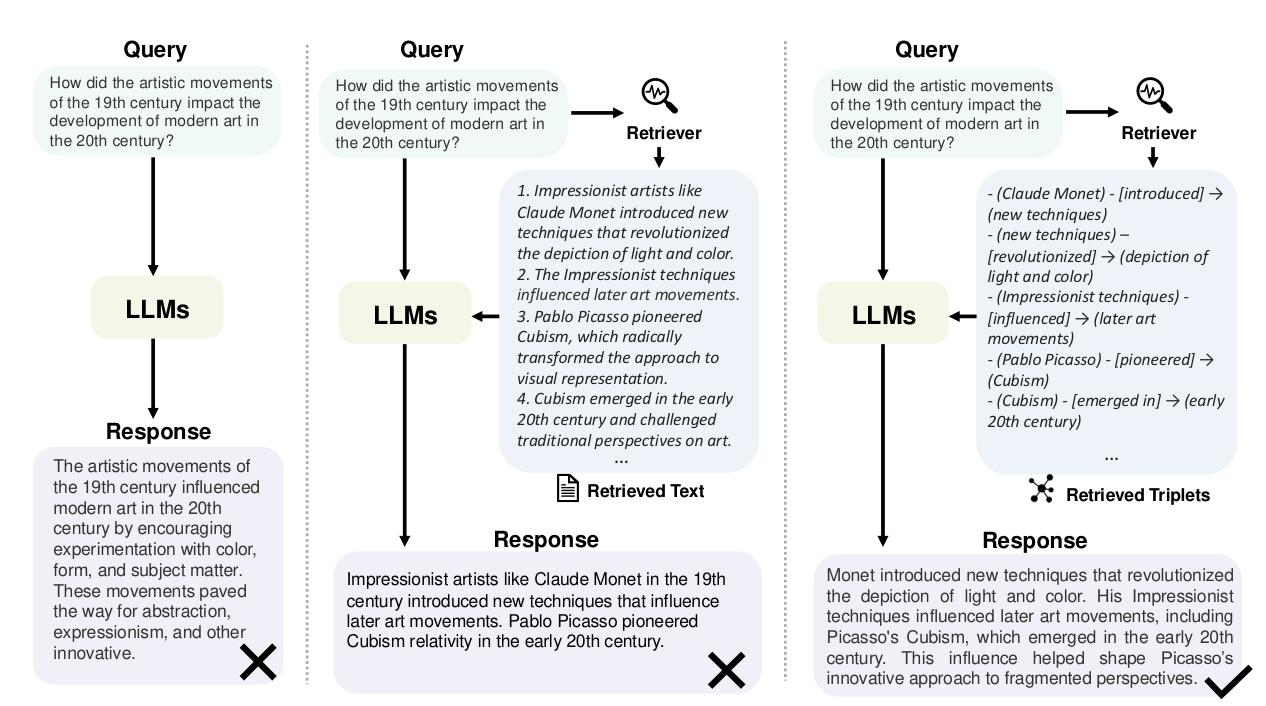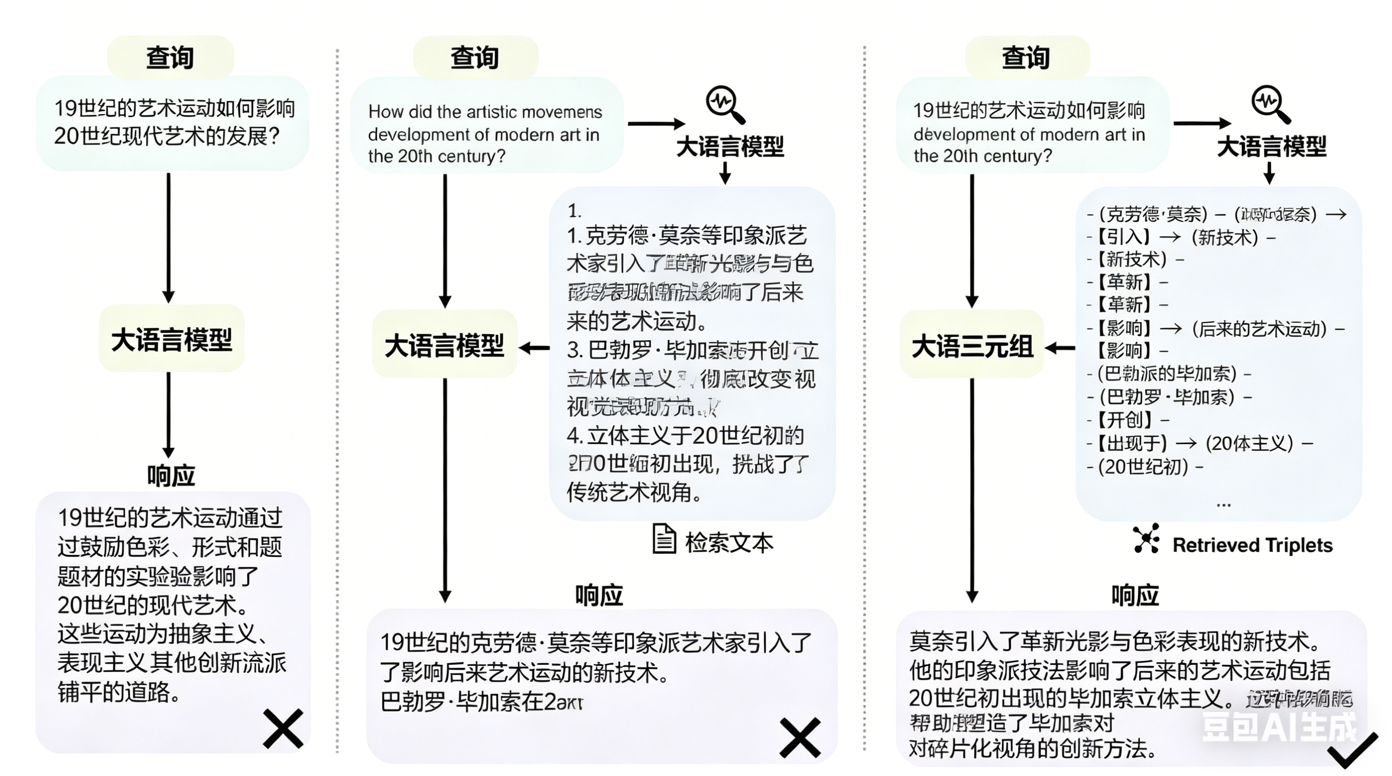 大语言模型可能会出现回答浅显、缺乏针对性的问题。检索增强生成(RAG)通过检索相关文本信息来直接作答,在一定程度上缓解了这一问题。图 1 直接使用大语言模型、RAG 与 GraphRAG 的对比然而,受限于文本长度以及实体关系在自然语言中灵活多变的表达形式,RAG 难以突出作为问题核心的 "影响" 类关系。与之不同,GraphRAG 方法利用图数据中显式的实体与关系表示,通过检索相关结构化信息实现精准作答。