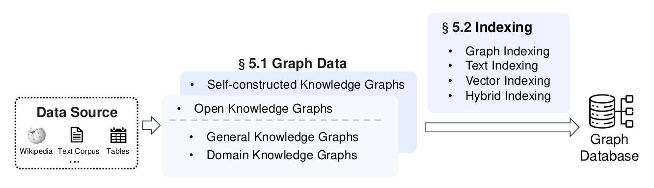 图数据库的构建与索引是 GraphRAG 的基础,图数据库的质量直接决定 GraphRAG 的性能。在本节中,我们对图数据的选取、构建方法以及所采用的各类索引方式进行分类与总结。