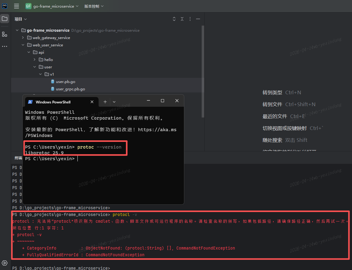 如图所示,在系统的 powershell 中可以执行 protoc 命令,但是在idea 内置的终端却不行;