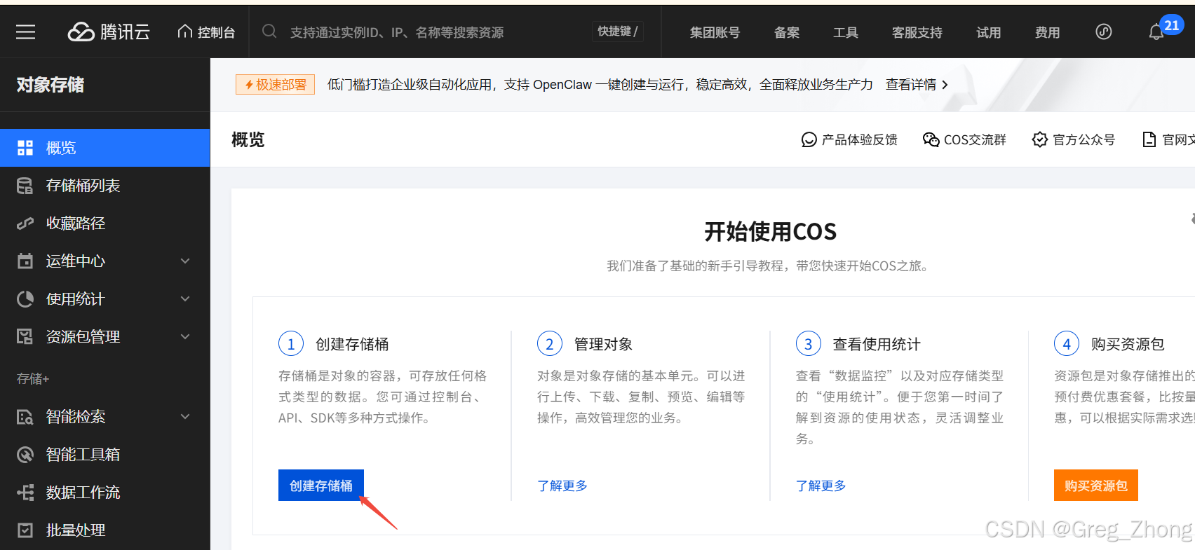 - 直接点击存储桶列表,刚才创建的桶在这,点击配置管理进入存储仓库内