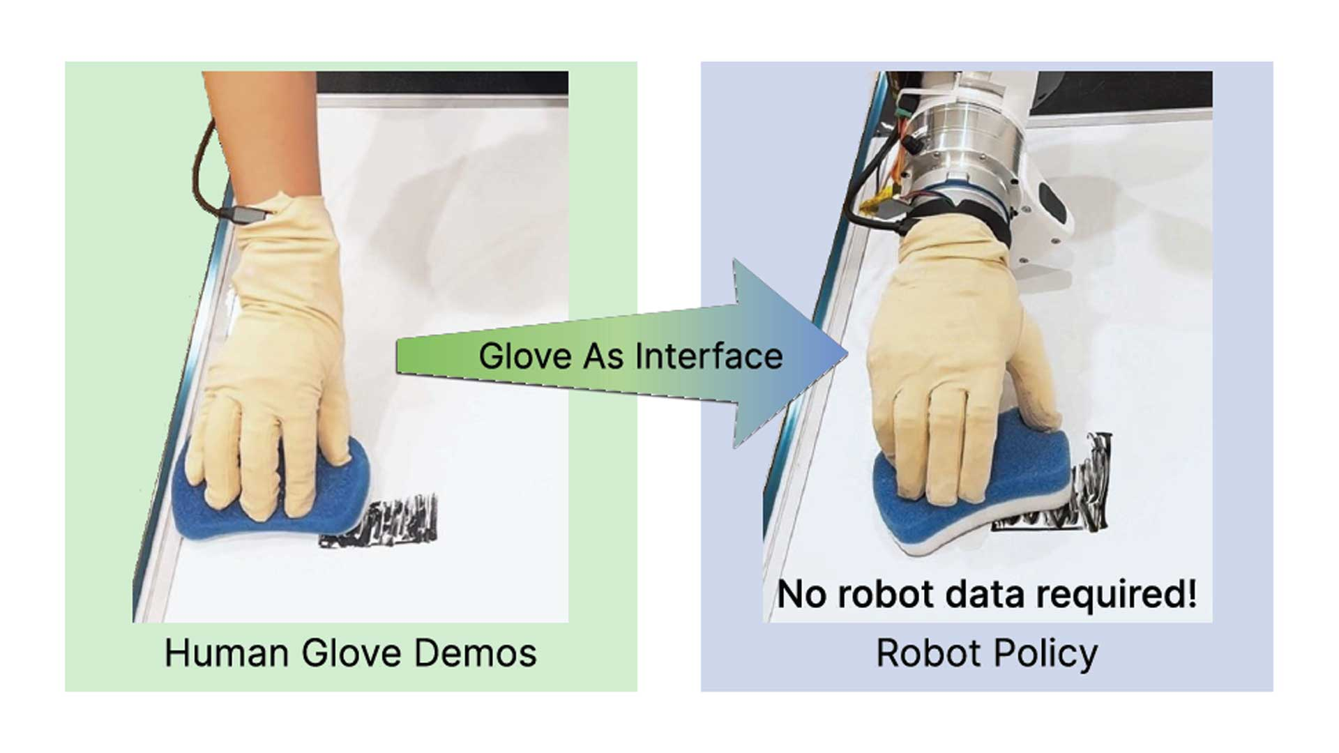 MANUS和OSMO系统在使用带有灵巧机械手的Franka机械臂的接触丰富的擦拭任务上进行评估。机器人使用MANUS手套和OSMO触觉反馈捕获的人类演示上进行训练,而无需使用人机交互数据。