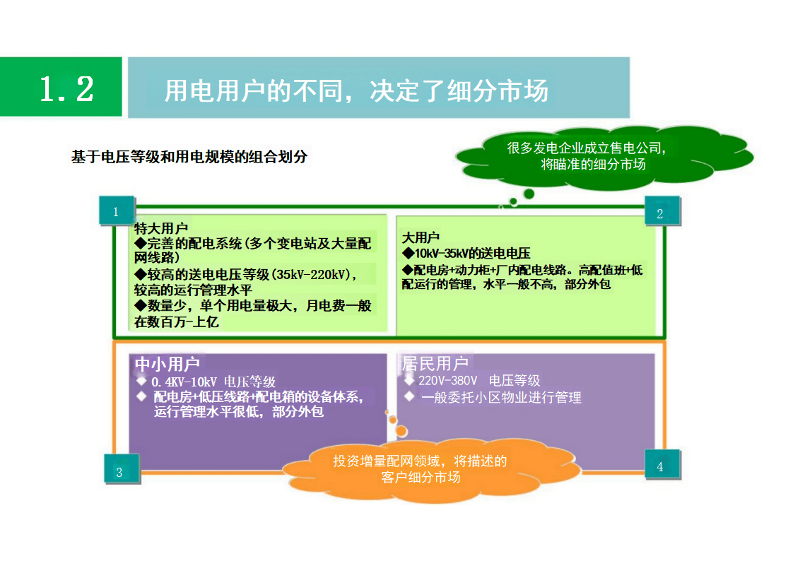 - 客户细分: 基于电压等级和用电规模,将市场划分为特大用户、大用户、中小用户及居民用户。