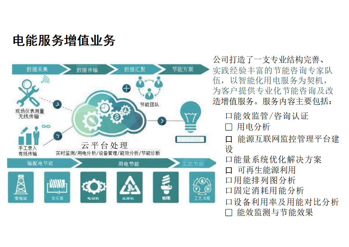 - 增值业务: 实时监测、用电分析、设备管理、能效分析、节能诊断及可再生能源利用。