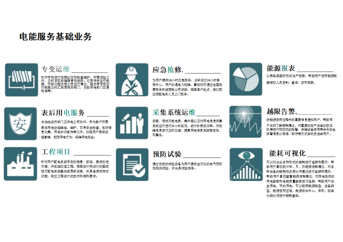 - 基础业务: 专变运维、应急抢修、表后用电服务、采集系统运维。