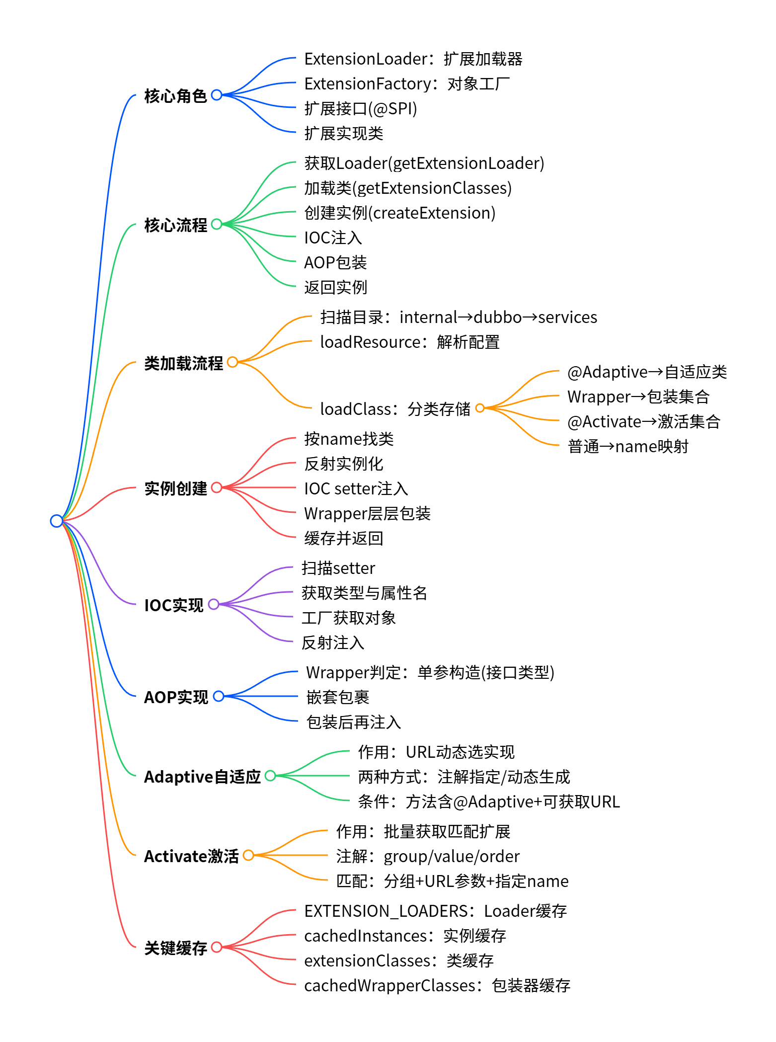 static ConcurrentHashMap<Class<?>, ExtensionLoader<?>> EXTENSION_LOADERS:Loader 全局缓存。ConcurrentHashMap<String, Object> cachedInstances:扩展实例缓存。Class<?> type:当前 Loader 对应的扩展接口。ExtensionFactory objectFactory:对象工厂,用于 IOC 注入。Map<String, Class<?>> extensionClasses:name→ 实现类映射。Set<Class<?>> cachedWrapperClasses:AOP 包装器集合。Class<?> cachedAdaptiveClass:自适应扩展类。Map<String, Class<?>> cachedActivates:激活扩展集合。String cachedDefaultName:默认扩展 name(来自@SPI("xxx"))。