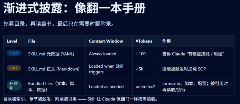 - Skill :采用 "渐进式披露" :