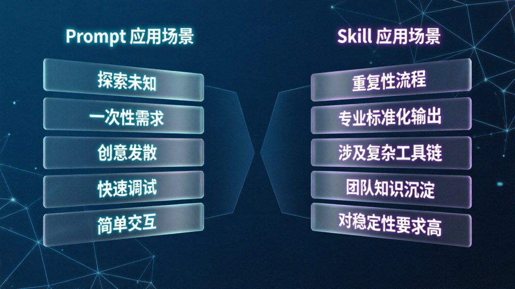 | 最佳适用场景 | 探索性、一次性、创意性、快速原型任务 | 重复性、流程化、专业性高、要求输出稳定的任务 | 头脑风暴、临时问答 vs 周报生成、代码审查、数据清洗 |