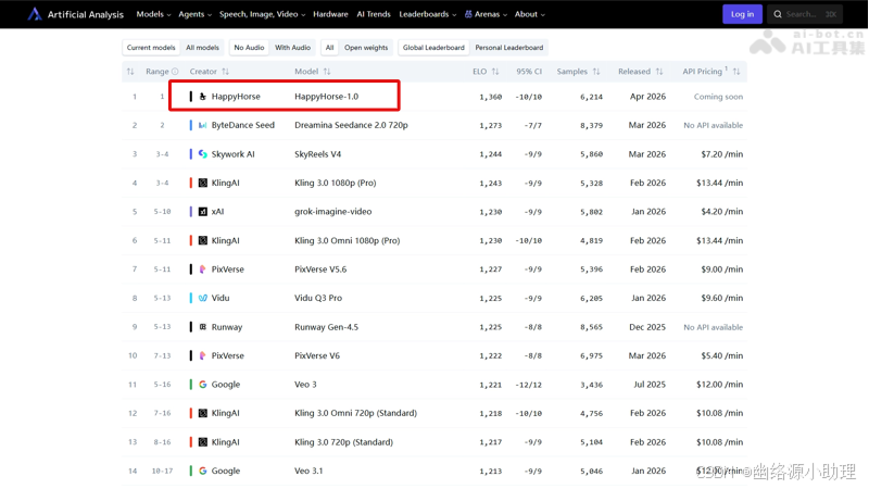 在权威评测机构Artificial Analysis的Video Arena榜单上,一匹代号为"HappyHorse"的匿名黑马突然空降,以断层式的优势横扫全球顶级模型。仅仅三天后,阿里巴巴正式"认领"了这匹黑马,确认其由ATH创新事业部研发。这一事件不仅终结了市场上关于其身份的猜测,更标志着国产AI视频模型在核心生成质量上,正式对国际头部产品发起了强有力的挑战。