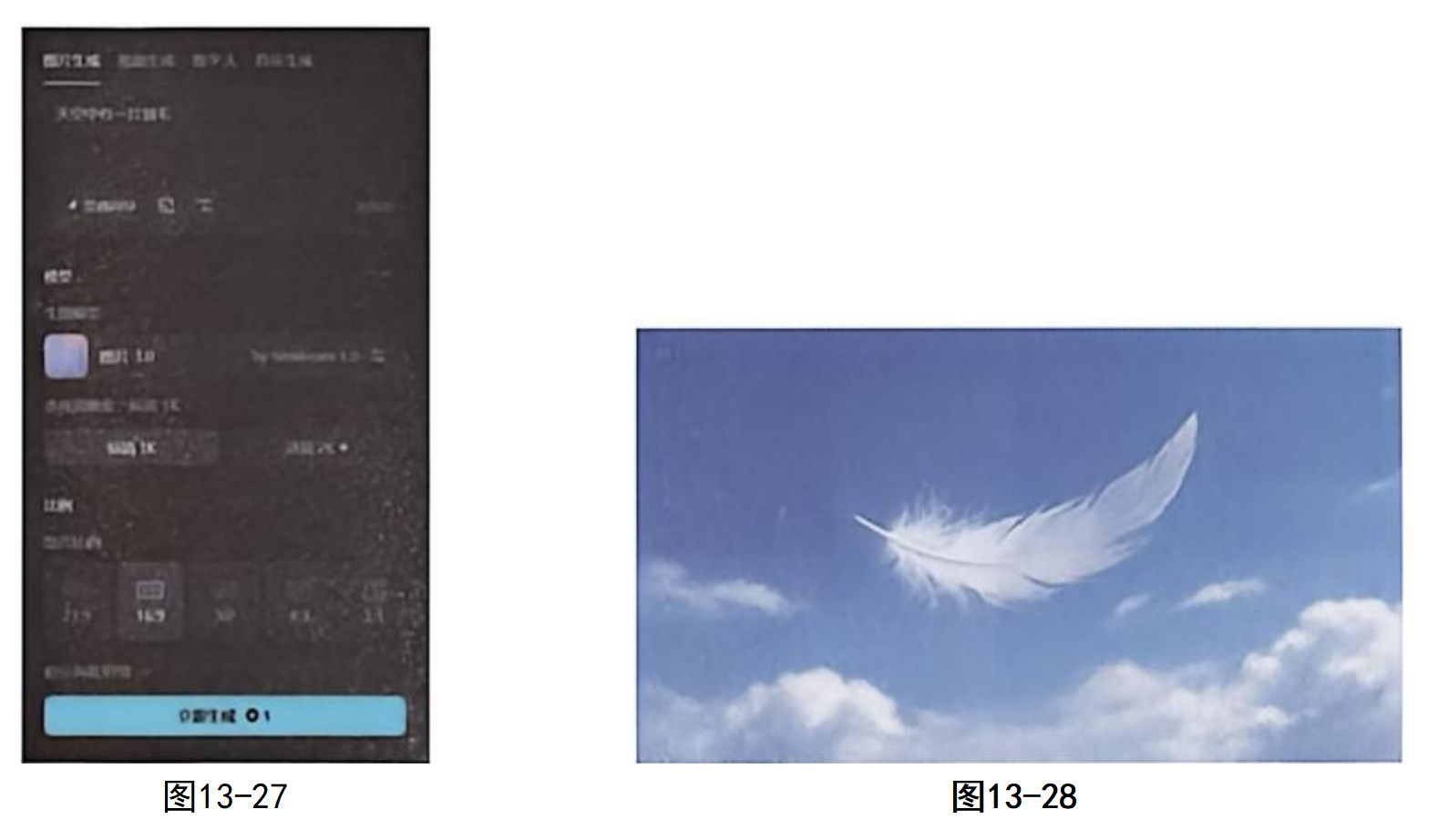 步骤02 进入"图片生成"页面后,在描述词输入框中输入文字,描述想要生成的图片,选择"图片3.0"模型,16:9比例,单击"立即生成"按钮,如图13-27所示。随即得到如图13-28所示的羽毛图片。