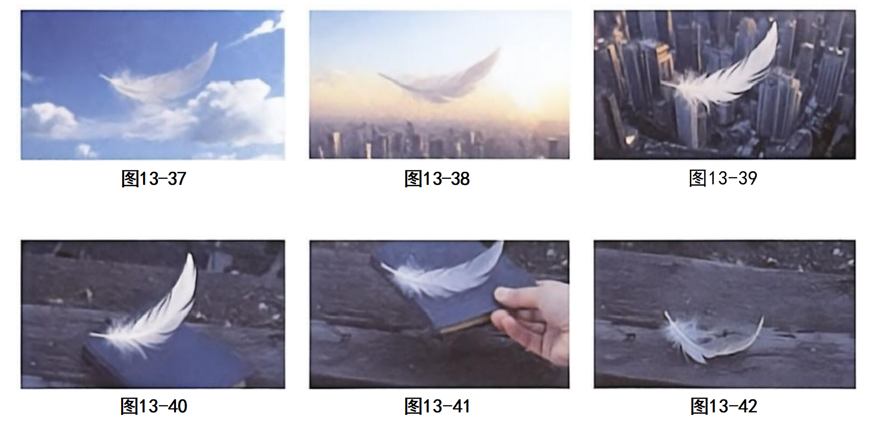 步骤09 这段AI视频完全依靠文本生图片、图片生视频的方式制作完成。由于每个镜头的首帧是上一个镜头的尾帧,因此能够很连贯地组接下来。镜头开端是一片飘在天空中的羽毛,随后镜头跟随羽毛缓缓下落,经过城市高空,最终落在一本书上。随后一只手入画,拿走了书,羽毛缓缓飘落,停留在原地。最终效果如图13-37至图13-42所示。