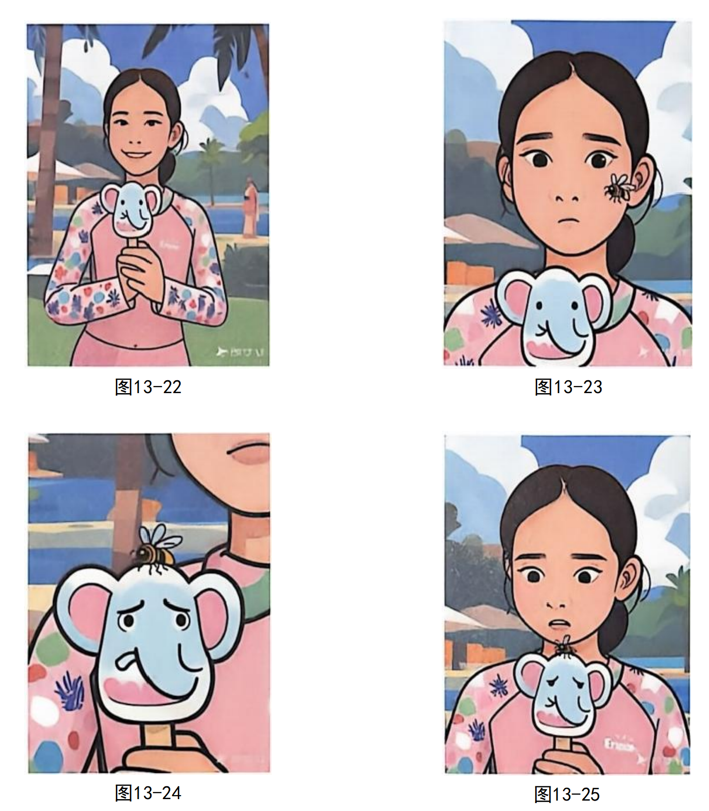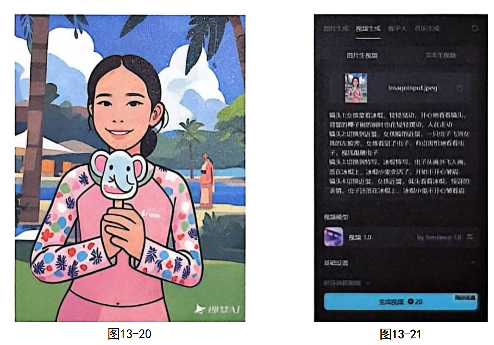 最新的视频模型不仅可以生成运镜复杂的单个镜头,甚至还可以通过一条描述词,一次性生成连续的、成组的多个镜头。下面的案例是根据一张图(见图13-20),生成一段有情节的视频:一个女孩开心地拿着冰棍,此时一只虫子落到了冰棍上,女孩惊讶极了。这段视频由4个分切镜头组成,是通过一段描述词直接生成的。具体的操作步骤如下。