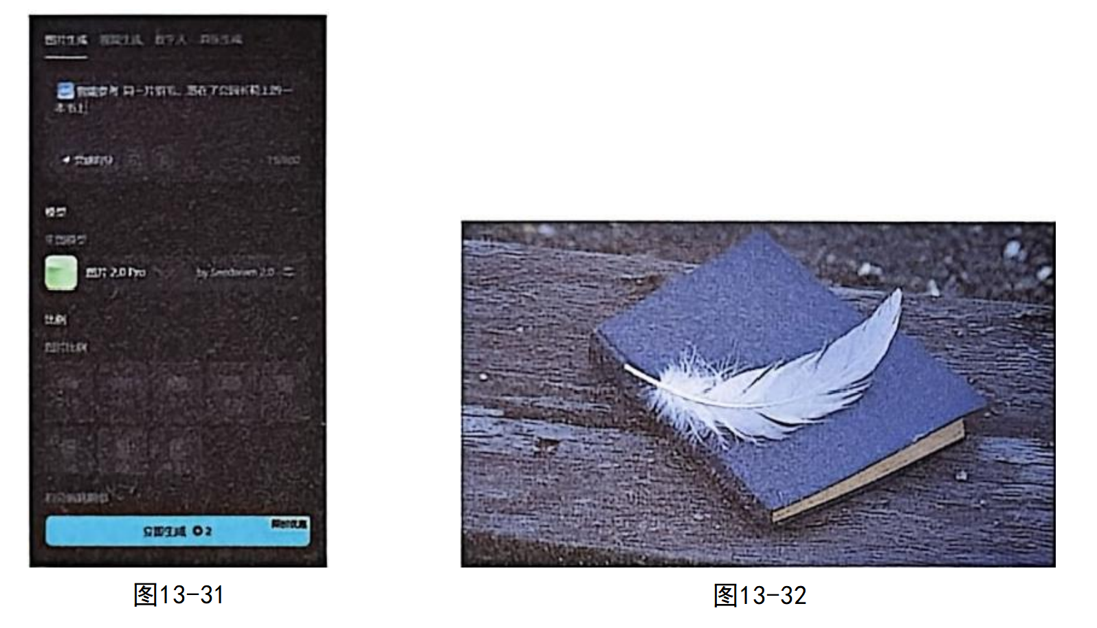 步骤03 回到"图片生成"页面,在描述词输入框中,单击"导入参考图"按钮,导入刚才生成的羽毛图片作为参考。在描述词输入框中输入文字,强调新图中要生成原图的羽毛,同时描述新图的环境细节,如图13-29所示。单击"立即生成"按钮后,得到如图13-30所示的新图。