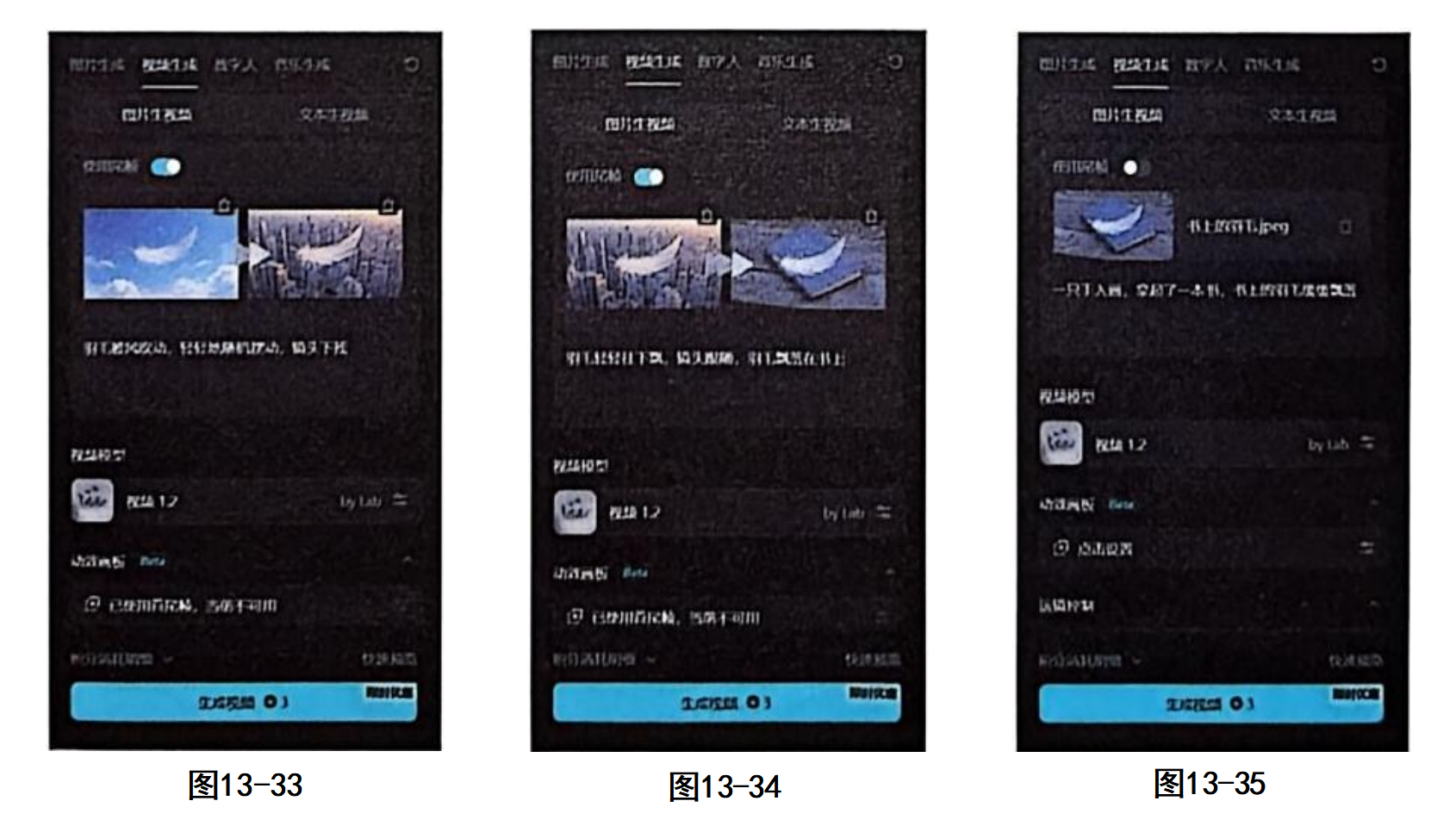 步骤06 生成第二段视频。同样在"视频生成"页面中,单击"图片生视频"按钮,选择"视频1.2"模型。首帧图片导入图13-30,尾帧图片导入图13-32,添加描述词,以生成羽毛从城市上空飘落到书本上的镜头,如图13-34所示。