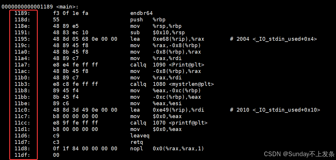 红色圈住的就是每条指令的地址(虚拟地址),严格来说应该是偏移量,但由于起始地址为0,偏移量即地址。也就是说,其实虚拟地址在我们的程序还没有加载到内存的时候,就已经把可执 行程序进行统一编址了。
