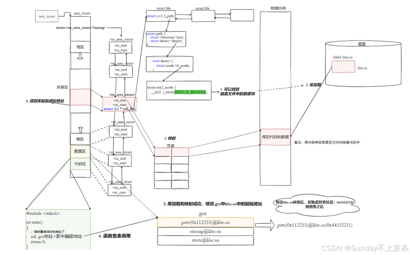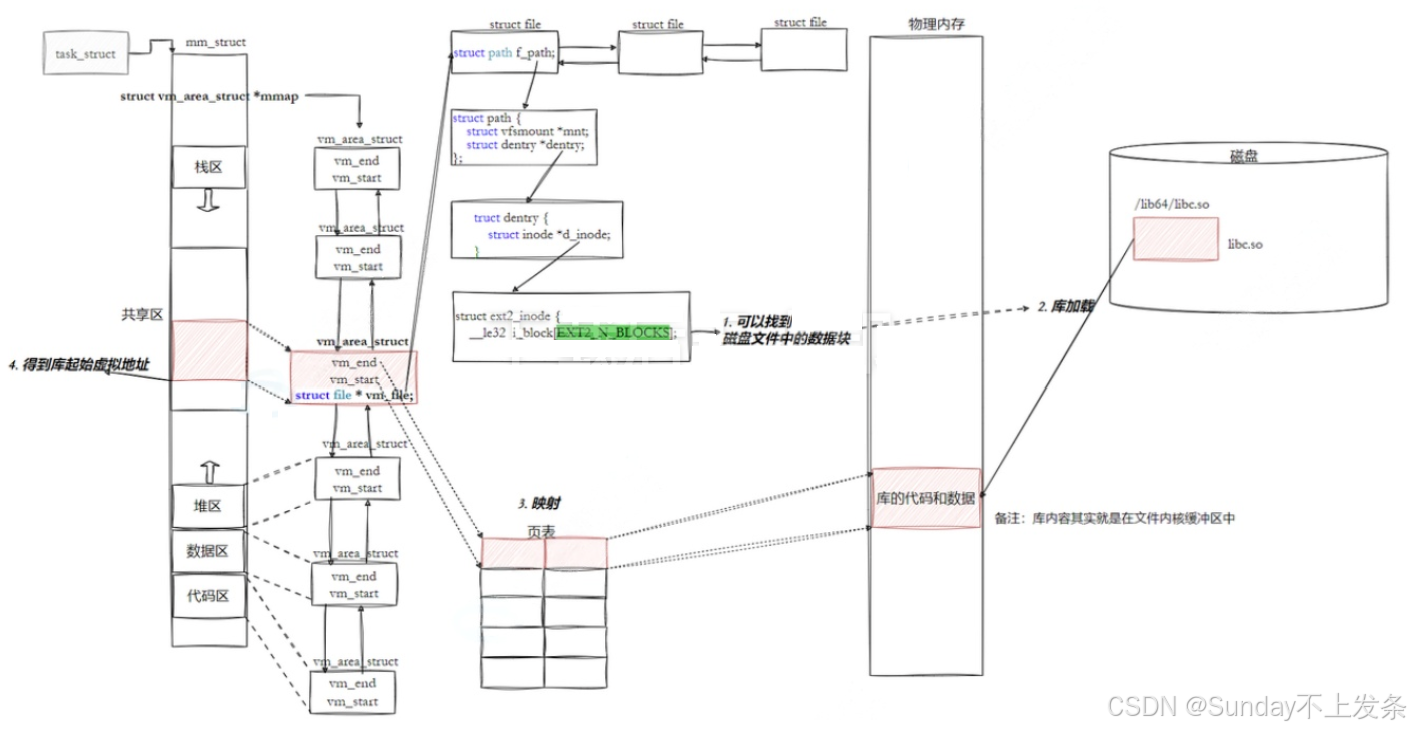 mmap把库映射到进程虚拟地址空间 - 内核为此创建一段 VMA(vm_area_struct)