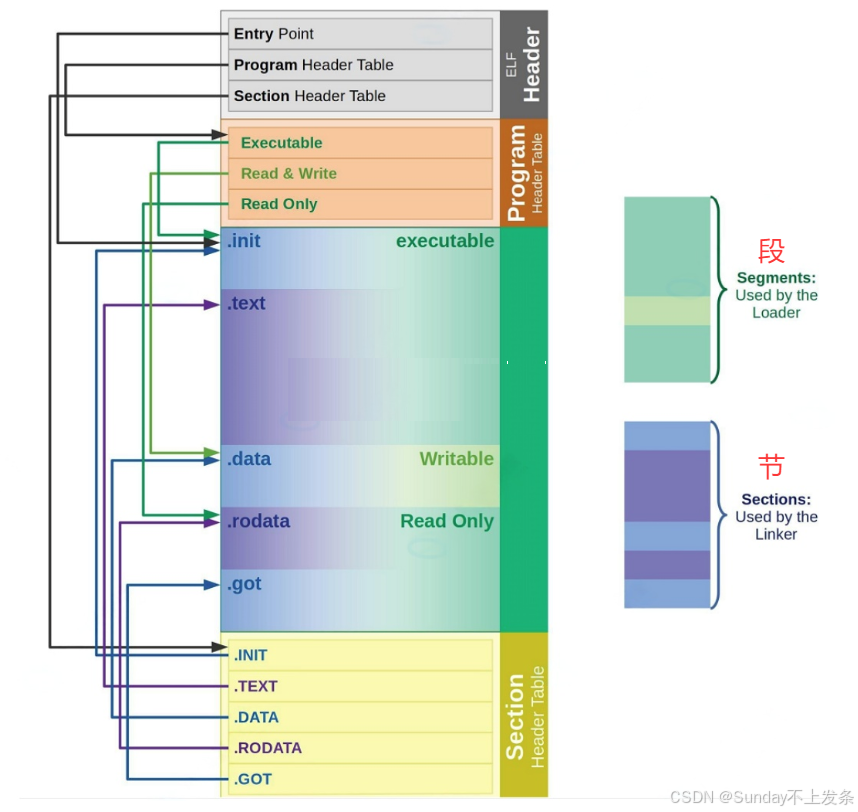 **• 节(Section ):**ELF文件中的基本组成单位,包含了特定类型的数据。ELF文件的各种信息和 数据都存储在不同的节中,如代码节存储了可执行代码,数据节存储了全局变量和静态数据等。