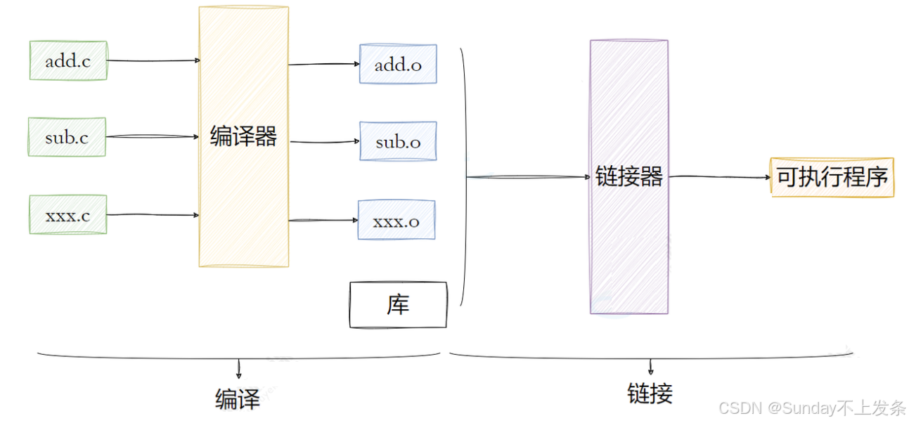 ▶️链接阶段:链接器把 多个 .o 文件 + .so/.a 库 拼成一个最终可执行 ELF。