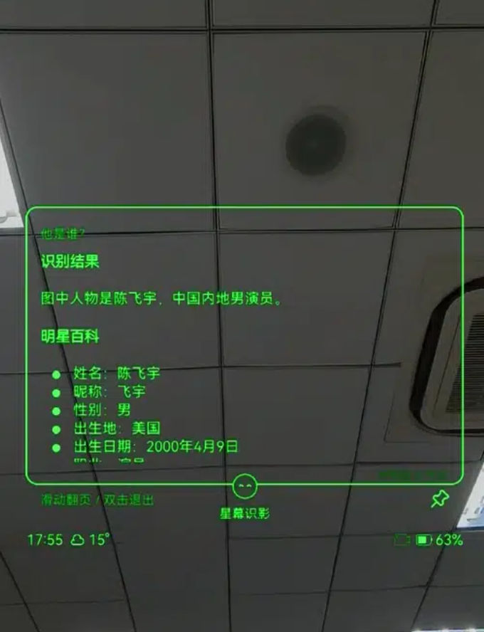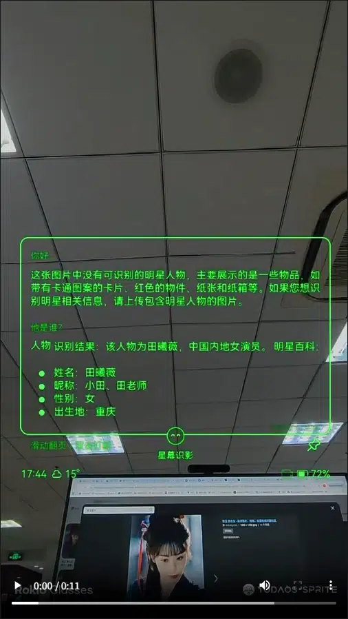 然后找一张近期热播剧的画面,对着眼镜下达识别指令。很快,镜片上浮出了演员姓名、角色名,以及她的百科信息,完全符合预设的回复框架。