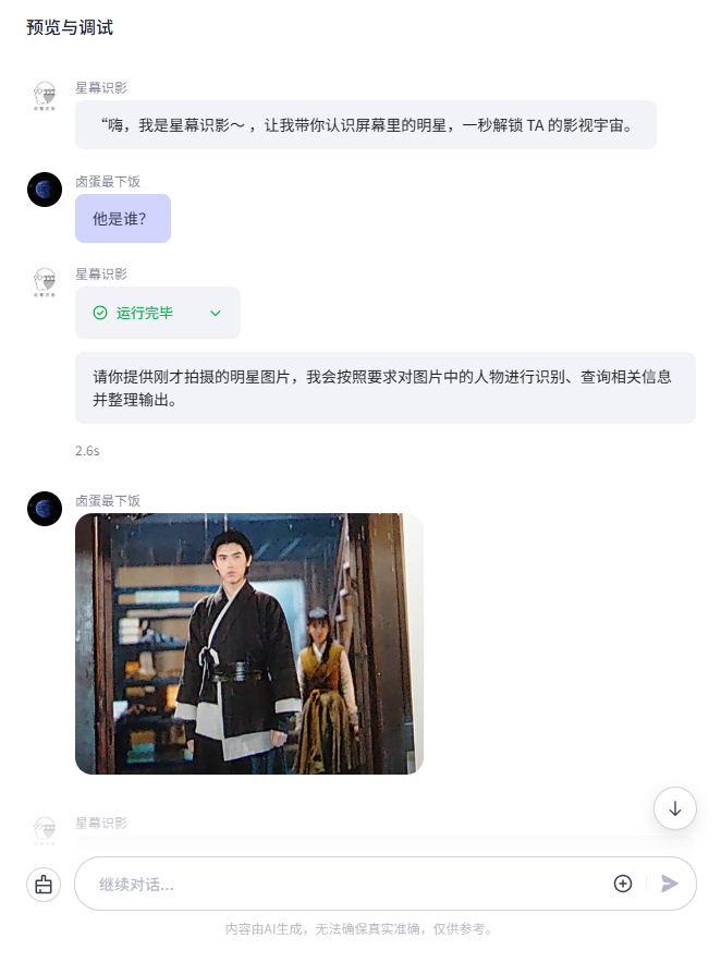 由于最终是和眼镜硬件配合,调试阶段我是直接传了一张图片给智能体,看它的识别逻辑是否跑得通。