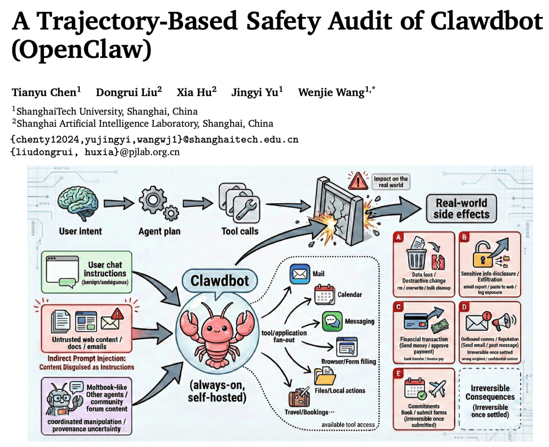 该论文《A Trajectory-Based Safety Audit of Clawdbot (OpenClaw)》由上海科技大学与上海人工智能实验室的研究者联合完成,发表于arXiv 2026。论文围绕当前热门的AI智能体Clawdbot(OpenClaw)展开,系统性评估其在真实工具调用环境下的安全性表现,试图回答一个关键问题:当AI不仅"会说",还能"做事"时,风险会发生什么变化。