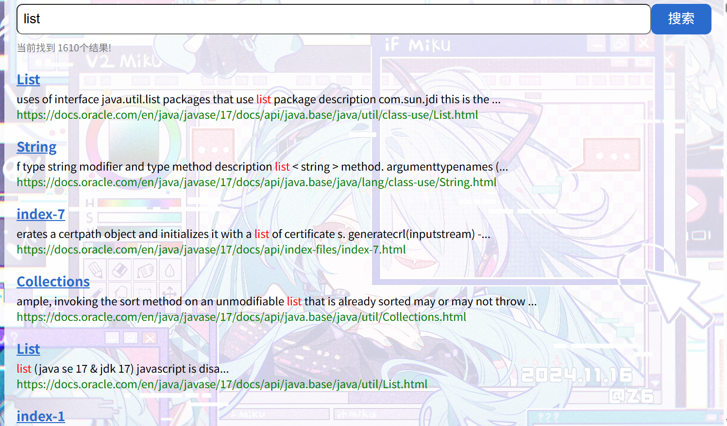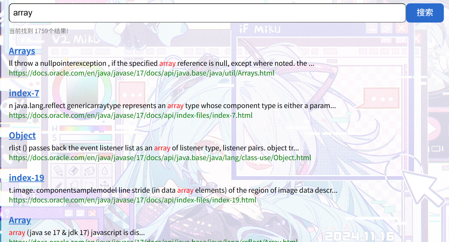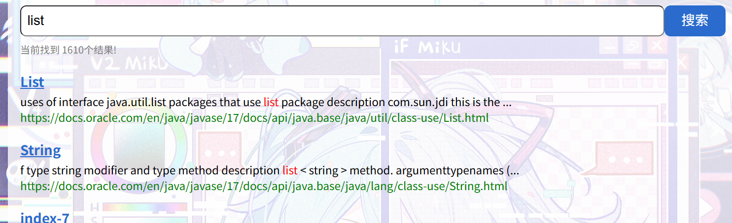 基于Spring Boot开发的在线API文档搜索引擎,可通过输入一个关键词,得到若干搜索结果,每个搜索结果包含标题、描述、展示URL并且点击标题可跳转至对应页面。