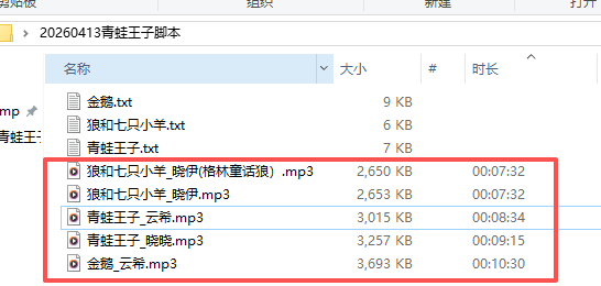 用男声云希做了《金鹅》,用女声晓晓《公主与青蛙》、女声晓伊《狼和七只小羊》