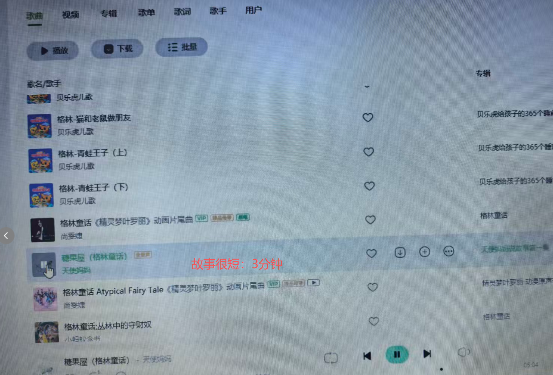 我就想到日常教学中一个问题:来园活动玩桌面玩具,8:40分左右收玩具坐下后,我们通常播放一个QQ音乐里面的"童话故事",让幼儿安静下来,准备喝牛奶。