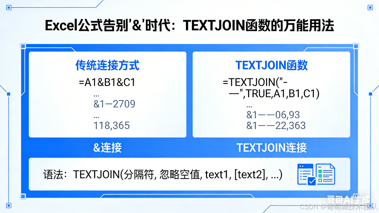 在 Excel 的世界里,合并文本曾是一件让人头疼的"体力活"。如果你还在用 & 符号点到手软,或者为了去掉多余的逗号而写复杂的 IF 嵌套,那么今天的主角------TEXTJOIN ,将彻底改变你的工作流。
