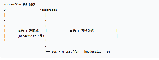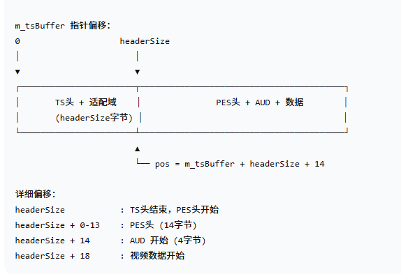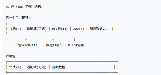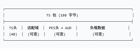 | 包1 | TS头 + 适配域(PCR) + PES头(14) + AUD(4) + 数据 | ~150 字节数据 |