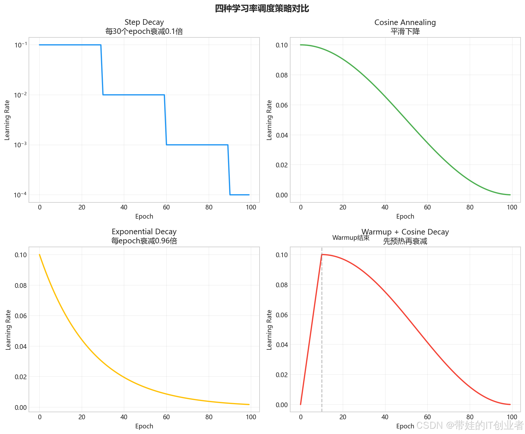 学习率调度是深度学习训练中的"配速策略"。就像跑马拉松不能全程冲刺一样,训练神经网络也需要在前期大步快跑、后期小步微调。本文介绍 Step Decay、Cosine Annealing、Warmup+Decay、ReduceLROnPlateau 等常见策略,帮你在不同场景下选择最合适的"配速方案"。