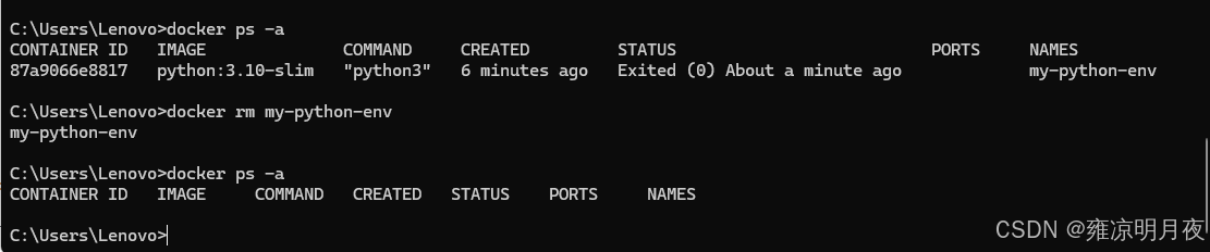 #查看正在执行的docker docker ps -a #删除指定的docker docker rm my-python-env