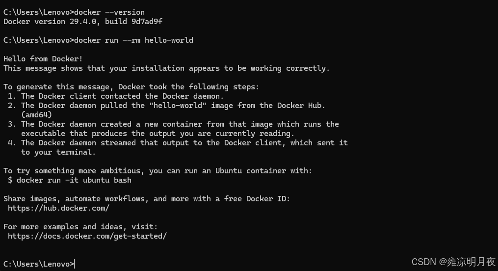 # 查看docker的版本 docker --version #跑docker的 hello world docker run --rm hello-world