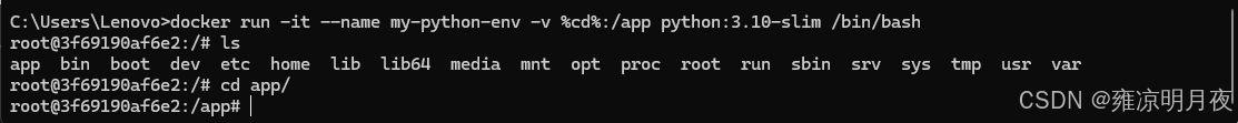 # 以我上述已存在的基础镜像为例这样会进入python编译框 docker run -it --name my-python-env -v %cd%:/app python:3.10-slim #建议直接使用该步骤更为明确 docker run -it --name my-python-env -v %cd%:/app python:3.10-slim /bin/bash #参数说明 -it 交互式终端 让你能进入容器敲 Linux 命令,像用本地终端一样。 --name my-python-env 给容器起名字 方便后续启停、进入,不用记长 ID -v %cd%:/app 目录挂载 把你当前的 C:\Users\Lenovo 文件夹,映射到容器内的 /app 目录 → 你本地改代码,容器里直接生效,不用来回传文件。 python:3.10-slim 指定镜像 用你已经下载好的这个 Python 环境 最后加了 /bin/bash,这是强制告诉 Docker:"直接给我一个 Linux 终端,不要直接进 Python!"注意重点: