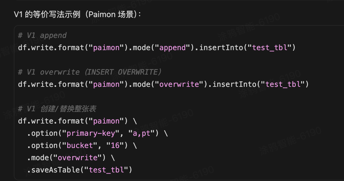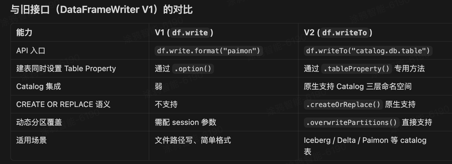 df.writeTo(...) 返回的是 DataFrameWriterV2,是 Spark 3.x 引入的 DataSource V2 写接口,与旧的 df.write (DataFrameWriter V1) 是两套完全不同的 API